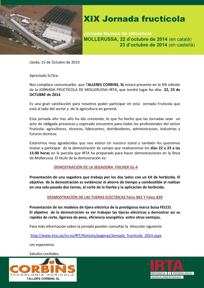 Los próximos 22 y 23 de octubre tendrá lugar en Mollerusa la XIX Jornada frutícola donde participaremos a las 13:00 h. con una demostración de...