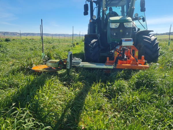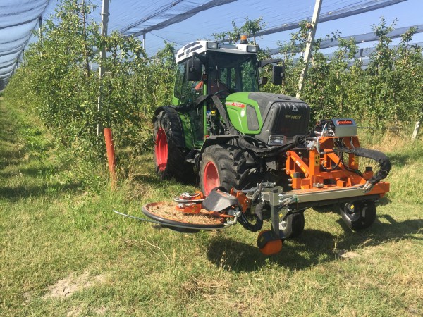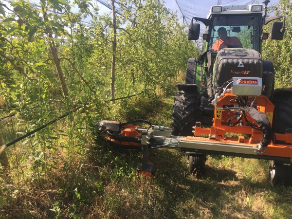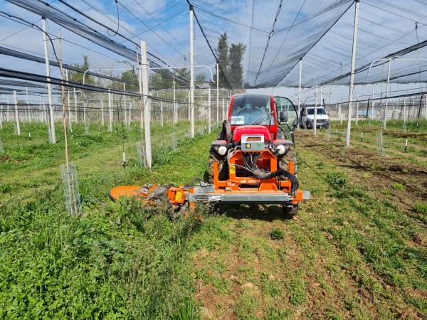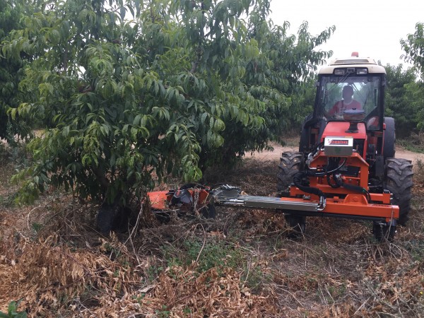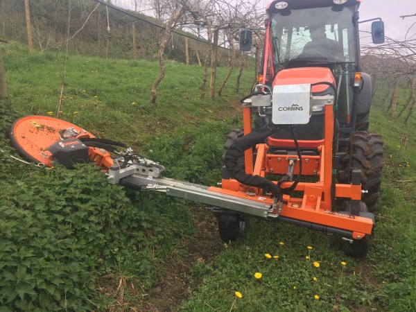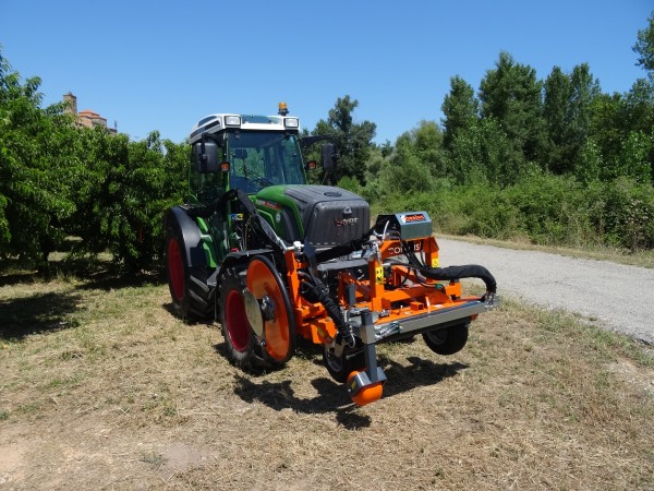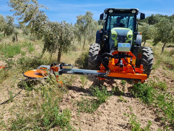 Nueva barra porta aperos TITAN SELF CONTROL .En el diseño de este nuevo tipo de barra hemos tenido muy en cuenta la ergonomia de trabajo del operario que va a utilizar la misma, su chasis central con regulacion de altura automatica y la barra extensible lateral con regulación de inclinacin automática + regulación de la inclinación del accesorio corta hierbas hidraulico permiten reducir de manera importante la comodidad del uso de la barra de corte interfilas aumentando la calidad y capacidad de trabajo y reduciendo la fatiga del usuario de la maquina convirtiendo la TITAN SELF CONTROL en el sistema de corte de hierbas interfilas mas avanzado de su sector. La barra dispone de regulacion de anchura de trabajo hidraulica, regulacion de la inclinacion del cabezal de corte hidraulico y regulacion de la altura de trabajo hidraulica, con sistema automatico de control de altura regulable a voluntad. En la misma barra TITAN SELF CONTROL se puede cambiar en cabezal de corte por otro distinto en tan solo unos minutos pudiendo elegir entre la gama de corte por cuchillas con discos de corte a distintos diametros, disco de corte ECO DISC con corte por hilos para plantas jovenes o plantaciones muy densas y tambien la alineadora de ramas de poda.