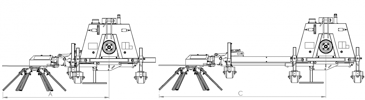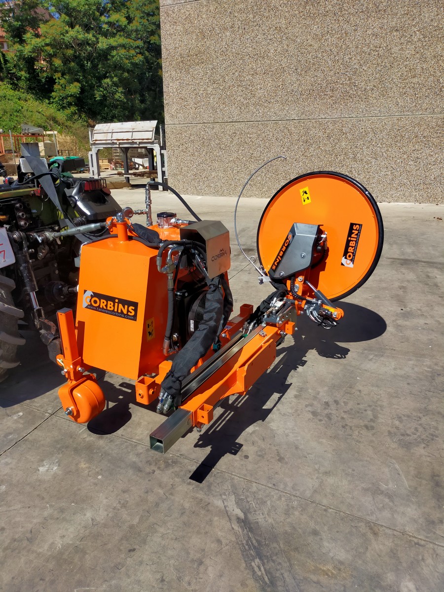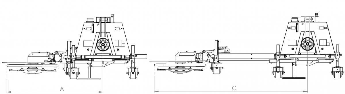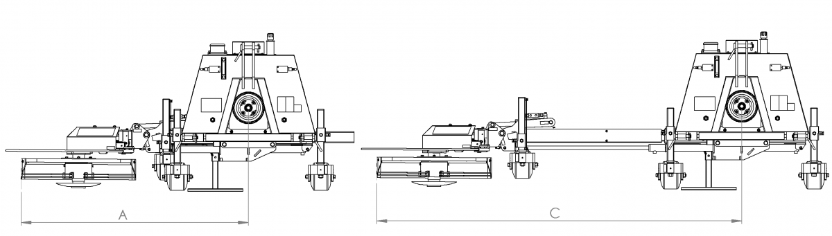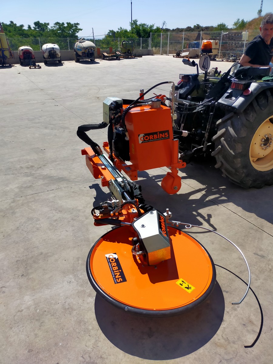 Cilindros de extensión e inclinación hidráulicos. Mando eléctrico ERGO para las funciones + arranque/paro del motor, accionamiento eléctrico plegado de emergencia del palpador. Brazo lateral pivotante para pendientes o caballones. Ruedas de control metálicas regulables en altura manualmente. Sistema integrado de palpador hidráulico.