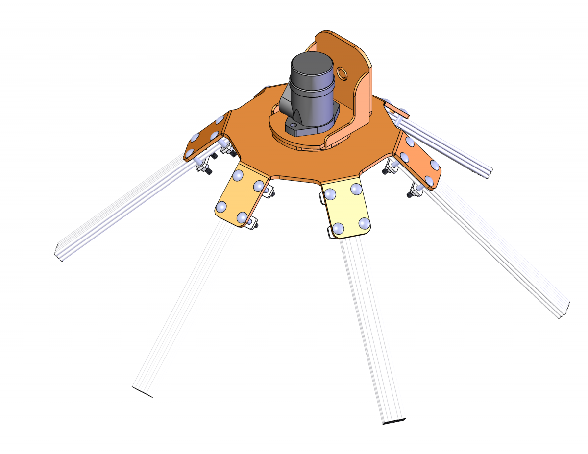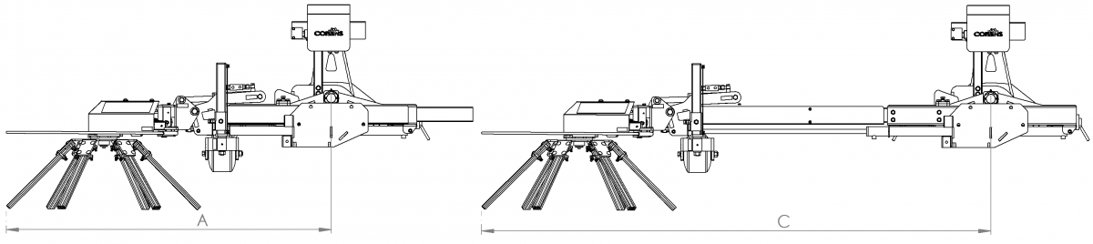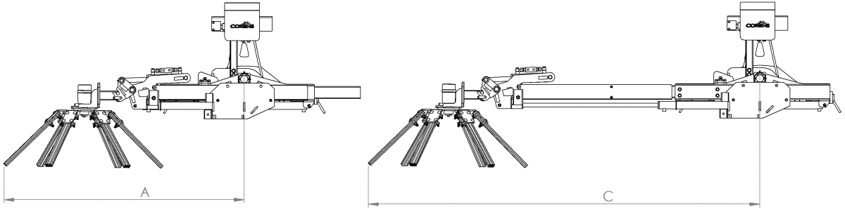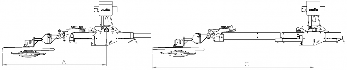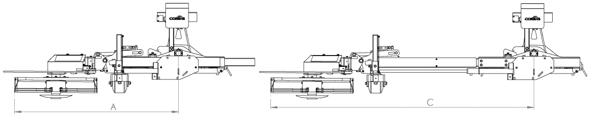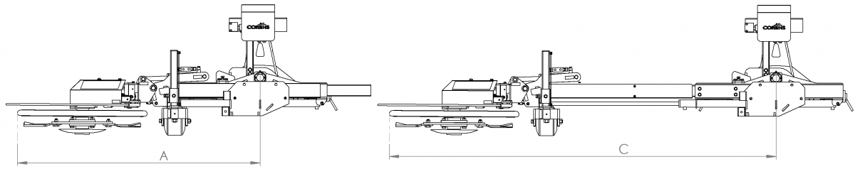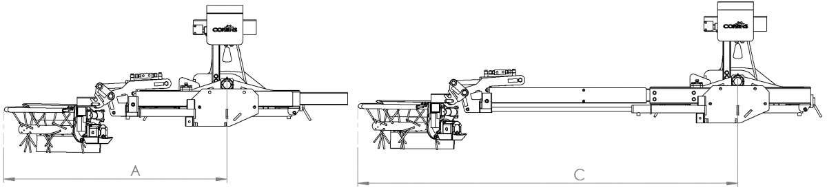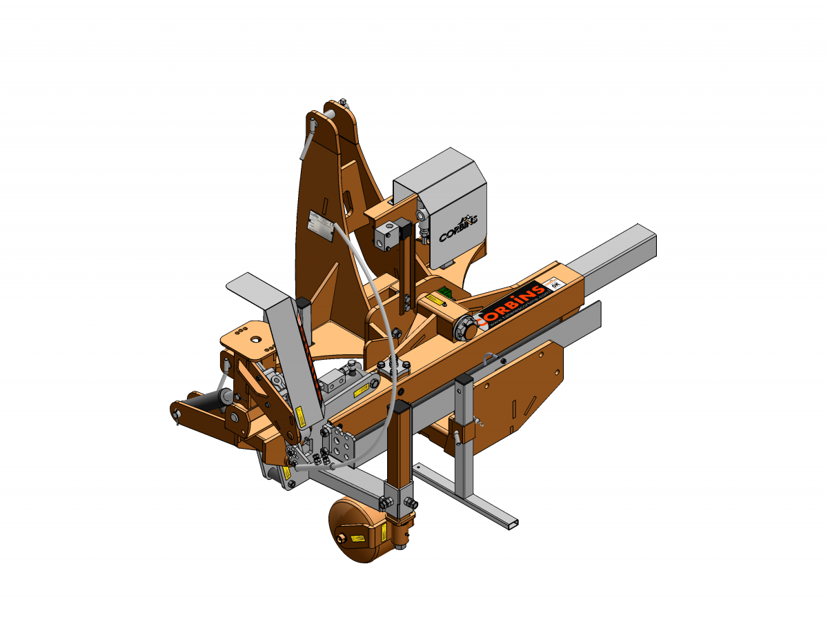 Porta útiles reforzado con enganche frontal a los 3 puntos categoría I/II, extensión e inclinación hidráulica, mando eléctrico ERGO 2 funciones + arranque/paro motor+palpador, accionamiento eléctrico plegado de emergencia del palpador. Brazo lateral pivotante para pendientes o caballones. Sistema de palpador hidráulico. Rueda de control metálica en brazo extensible.