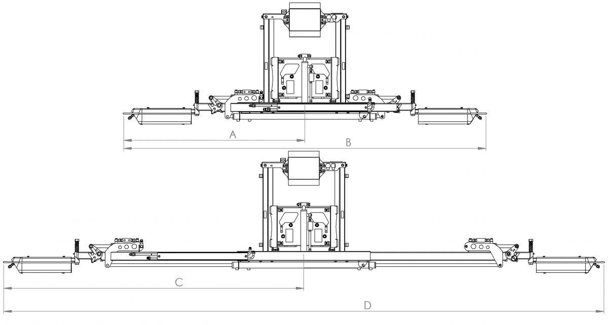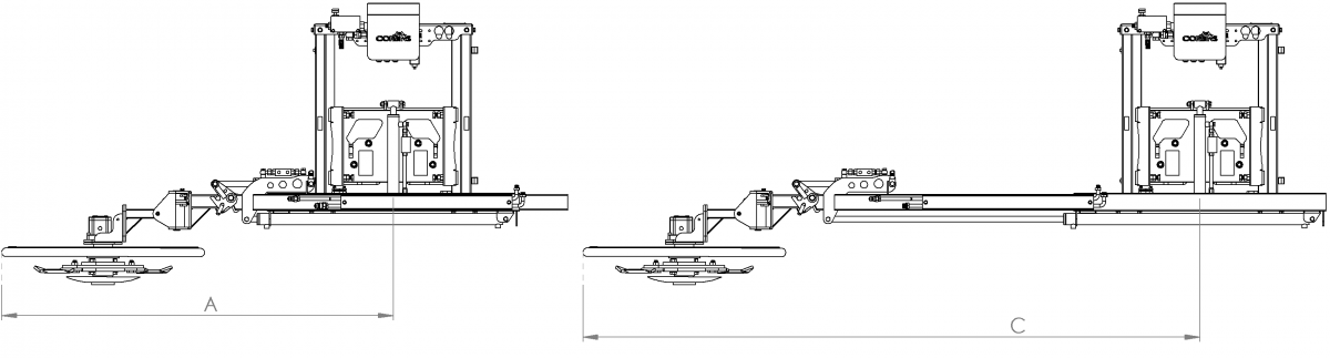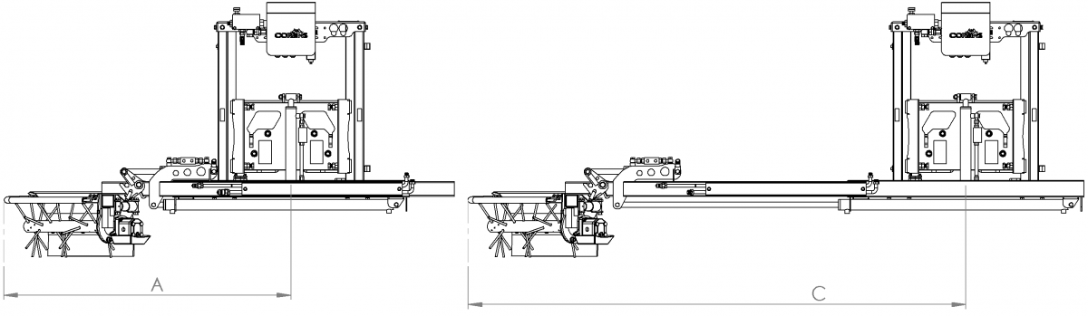 Porta útiles para la parte frontal del tractor. Chasis de 1 lado apto para todos los accesorios, chasis de 2 lados apto únicamente para pantallas de herbicida. Movimientos hidráulicos, elevación, extensión e inclinación, mando eléctrico ERGO 3 o 5 funciones + arranque/paro motor. Sistema enganche rápido para los cabezales intercambiables.
