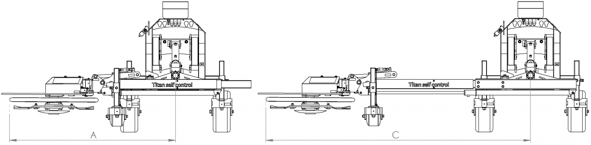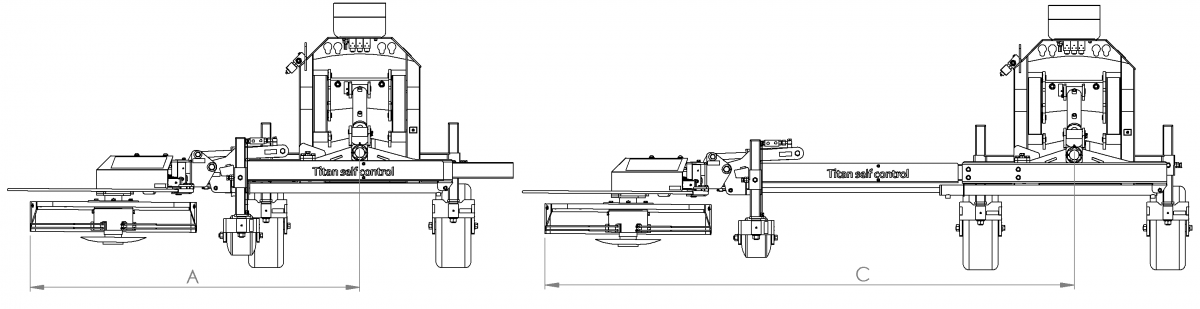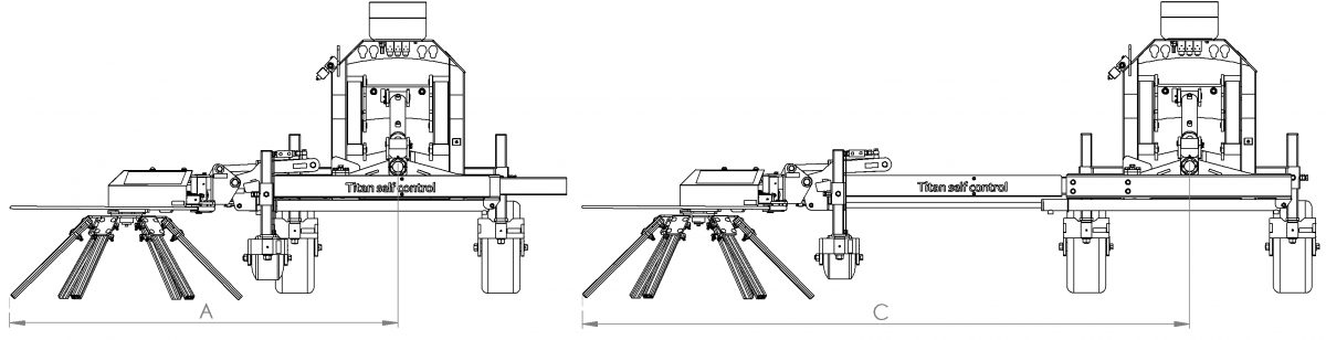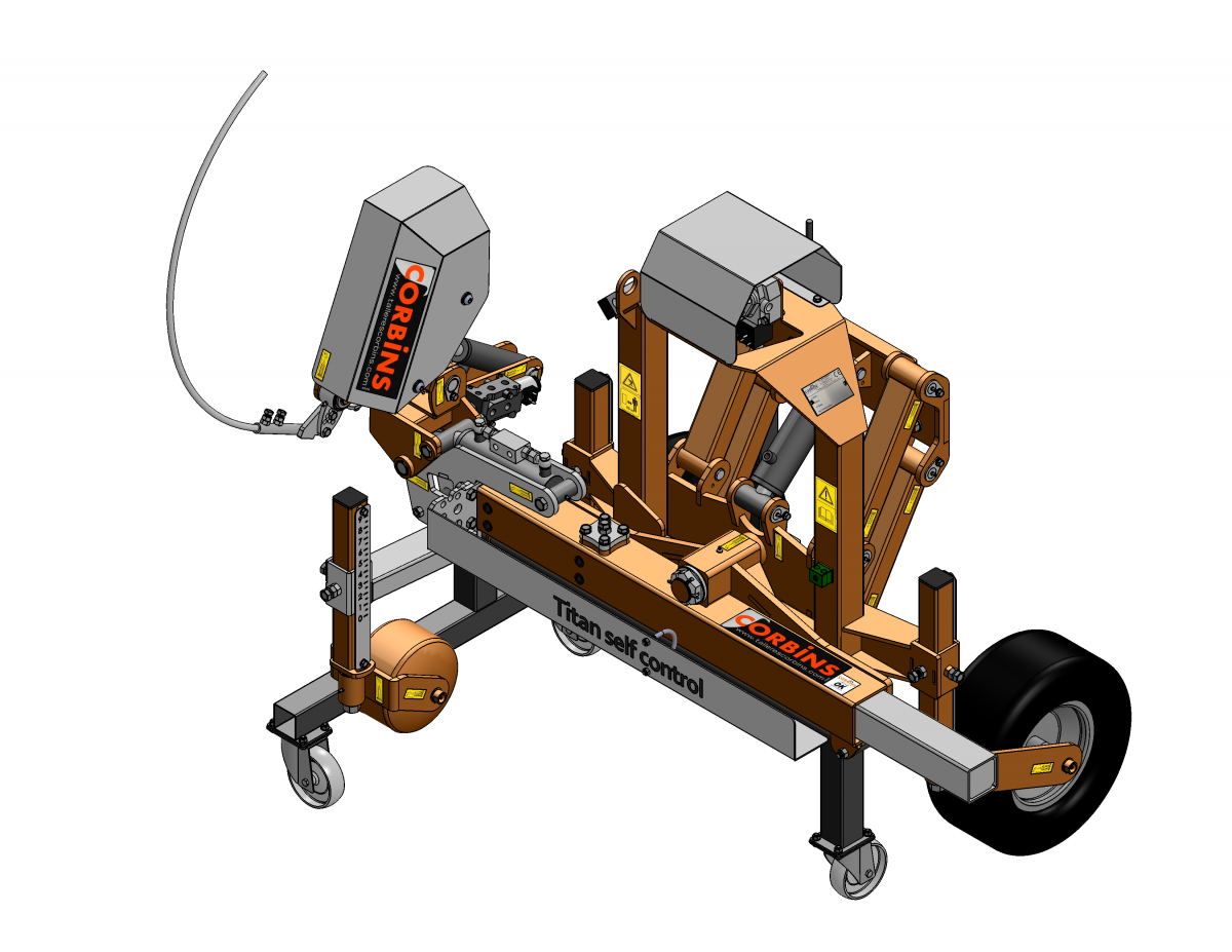 Porta útiles para adaptar a la parte frontal del tractor. Chasis pivotante al terreno, sistema flotante. Cilindros de elevación, extensión e inclinación hidráulicos. Mando eléctrico ERGO para las funciones hidráulicas + arranque/paro del motor, accionamiento eléctrico plegado de emergencia del palpador. Ruedas de control neumáticas en la parte central del chasis y una rueda metálica en el extremo del brazo. Sistema integrado de palpador hidráulico. Carro de apoyo con ruedas para enganche/desenganche y almacenaje.