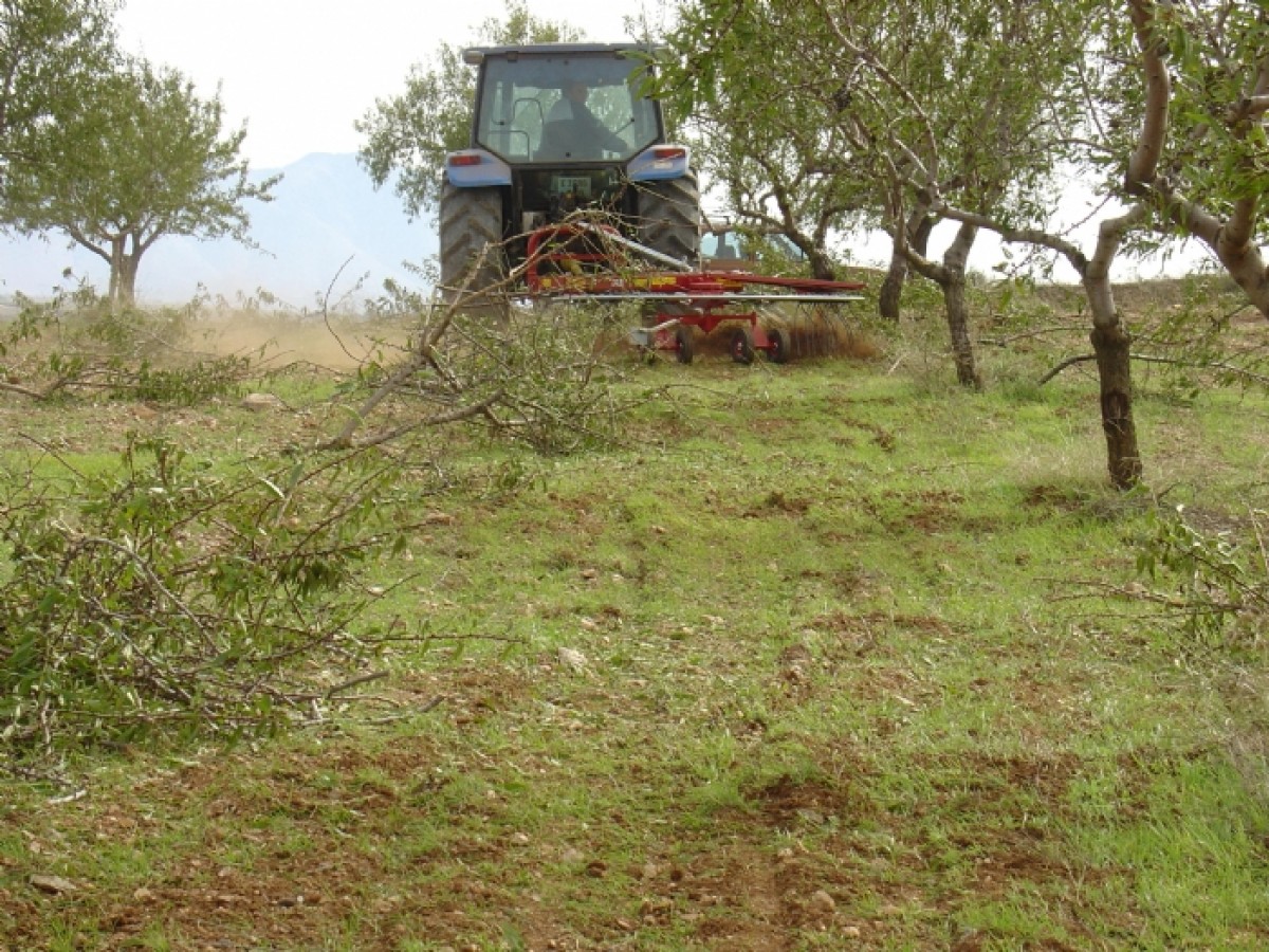 Alineadora de restos de poda para plantaciones de olivos, almendros melocotoneros, naranjos, etc. Caja de engranajes de alta calidad y bañada en aceite. Desplazamiento lateral manual (opcional desplazamiento hidráulico).