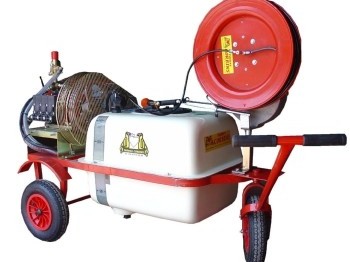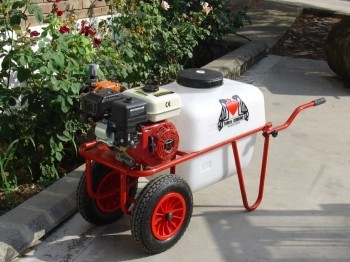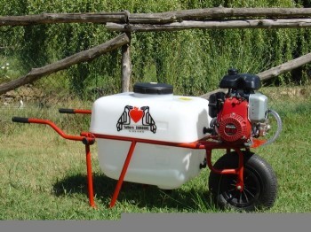 Carretillas para la pulverización de horticultura y jardinería con una amplia gama de modelos, tipo hobby o profesional. Depósito de 50 l. en polietileno. 2 ruedas delanteras. Chasis de tubo. Tapa con filtro de llenado. Brazos desmontables. De serie equipada con 1 pistola y 10 m. de manguera.
