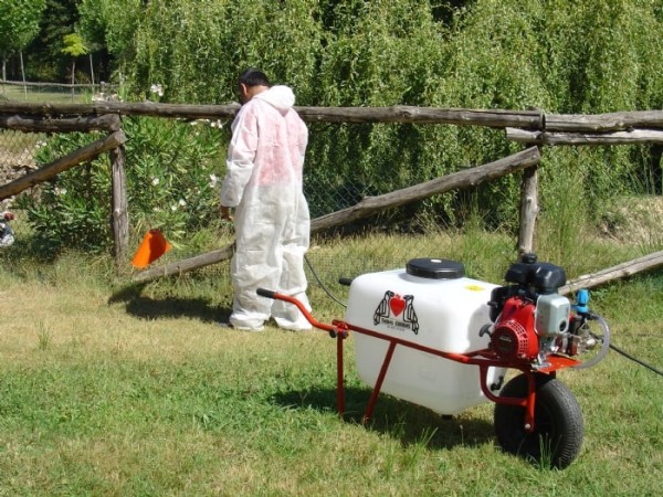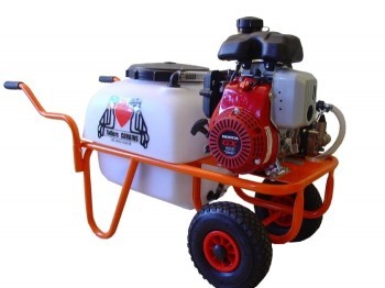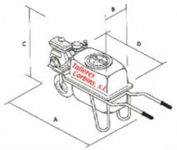 Depósito de 100 l. en polietileno. 1 rueda delantera. Chasis de tubo. Tapa con filtro de llenado. Brazos desmontables. De serie equipada con 1 pistola y 10 m. de manguera.