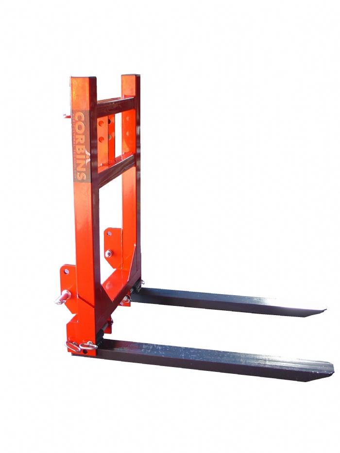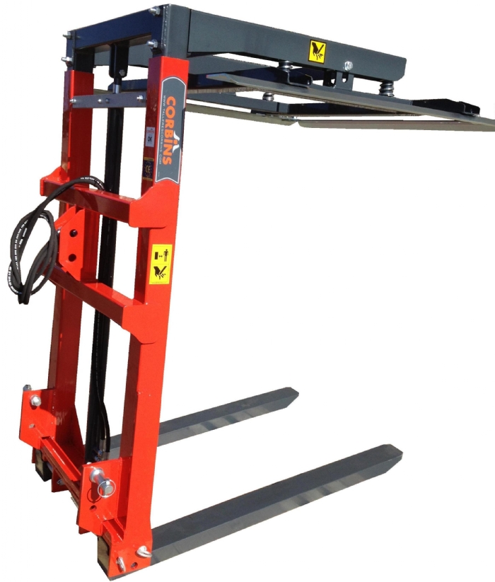 Elevador simple adaptable a los tres puntos del tractor, con horquillas plegables. Opcional: Tercer punto hidráulico o prensa cajas hidráulico.