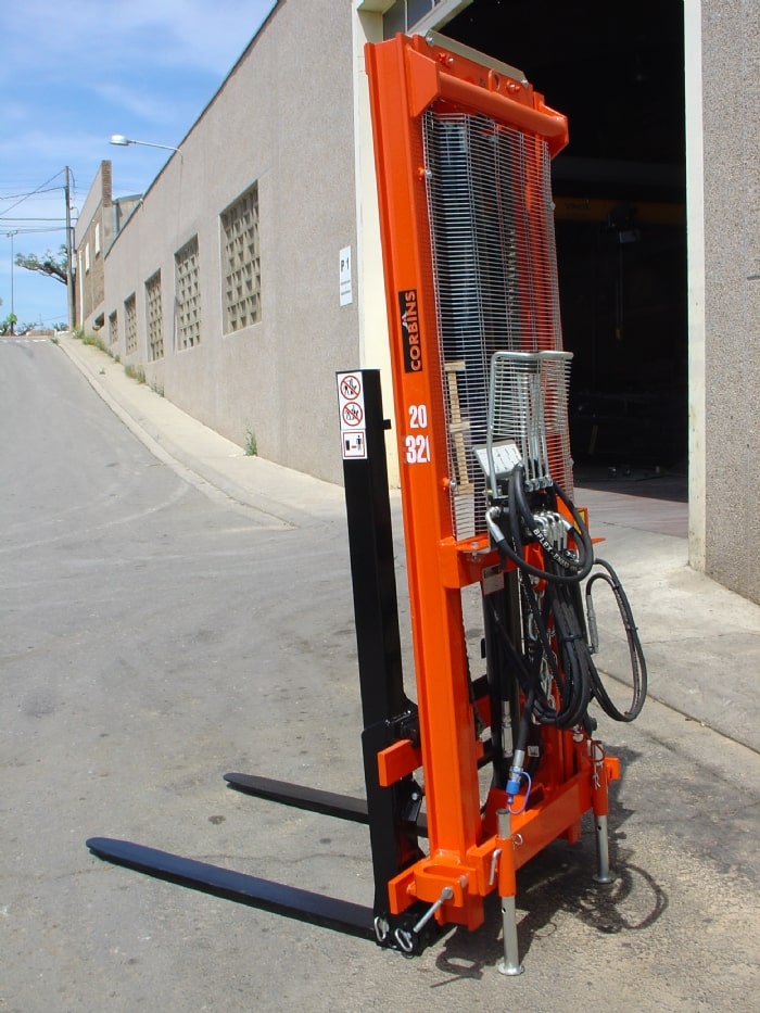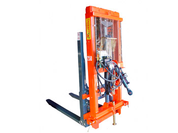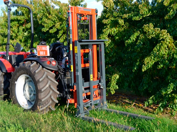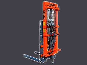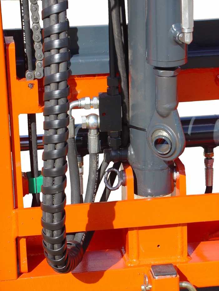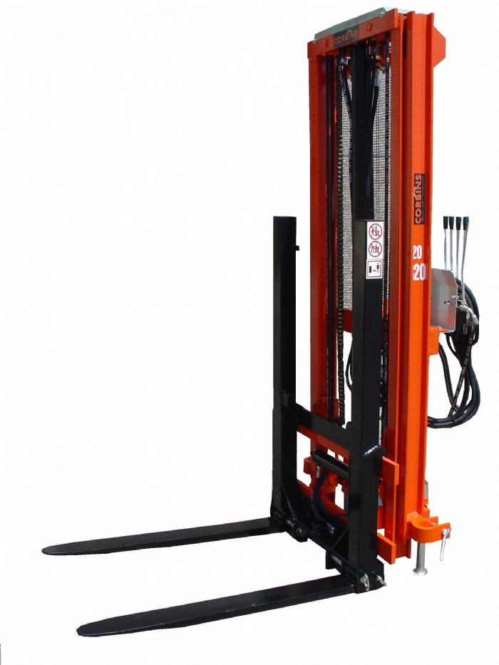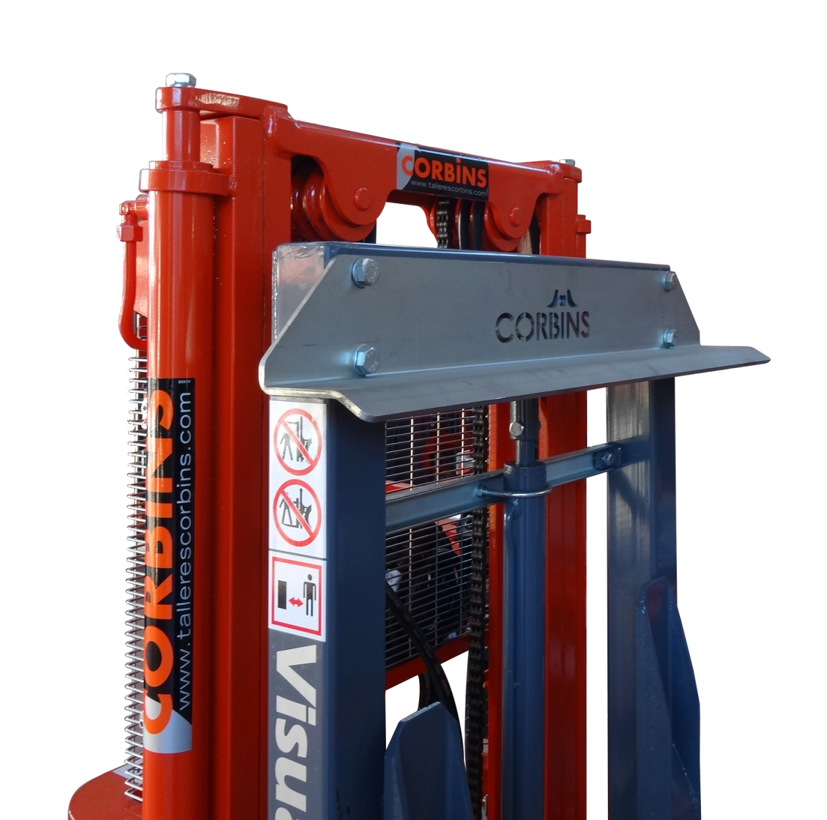 Elevador sistema dúplex, pistón central de doble efecto, doble cadena tipo "fleyer", perfiles de elevación en acero en forma de I calidad ST52.3 laminado en caliente, rodamientos de rodillos reforzados, horquillas plegables, movimientos: elevación, inclinación y desplazamiento. De serie con distribuidor manual de 3 palancas.
