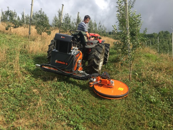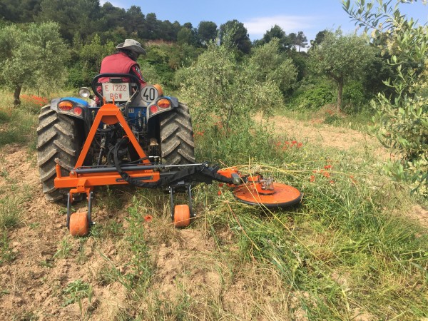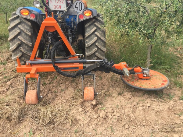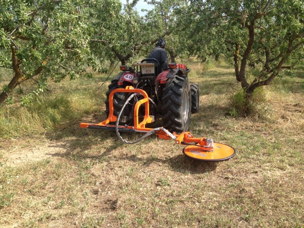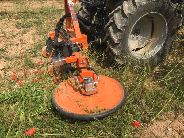 Disco corta hierba para plantaciones de arboles frutales, almendros, olivos etc. Accionada con el hidráuilikco del tractor, dispone de un disco corta hierba de 600 o bien 800 mm de diametro. Regulación de la inclinación del disco en dos sentidos hacia arriba y hacia abajo.Regulación de la velocidad de rotación del disco corta hierba. Opcionalmente se puede montar desplazamiento hidráulico, central hidráulica independiente o sensor intercepas automatico.