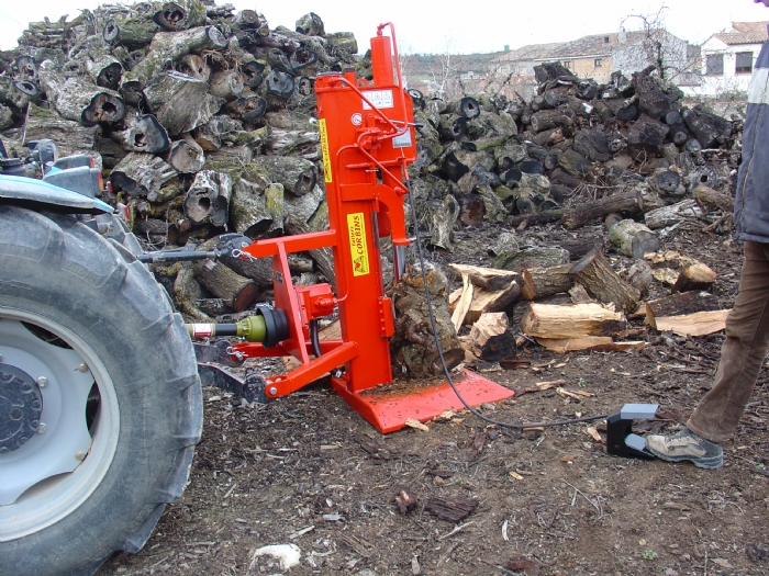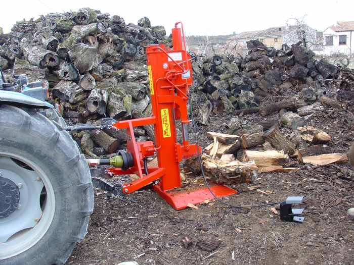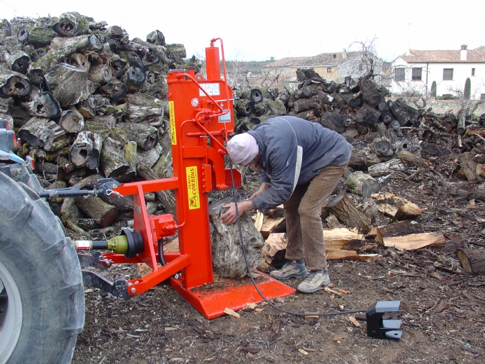 Astilladora para troncos con bomba hidráulica independiente. Doble accionamiento con pulsador de mano y de pie. Fuerza 10, 15 o 18 ton., altura cuchilla 300 mm., RPM max. 540.
