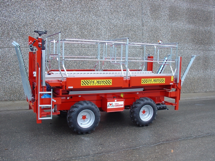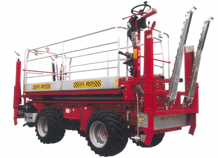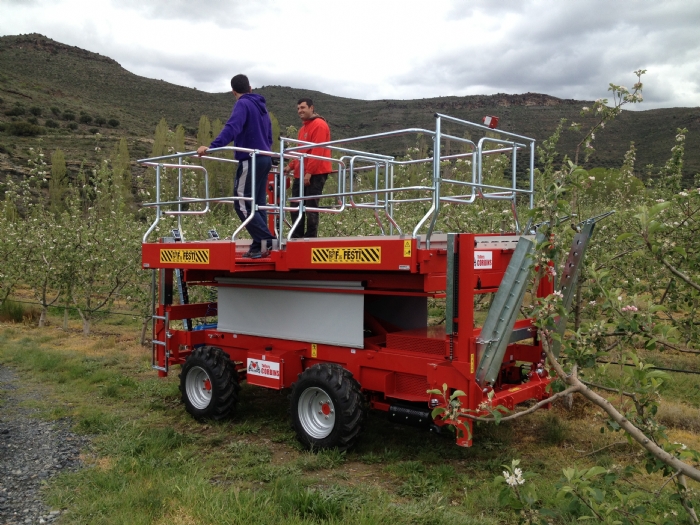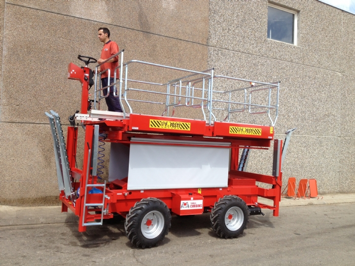Plataforma única elevación hidráulica (largo 3 m.) con apertura hidráulica: ancho 1'30 / 1'50 / 1'70 / 1'80 m. hasta 2'28 / 2'80 / 3'10 / 3'30 m., altura max 2'50 m. 4 ruedas motrices. 2 o 4 ruedas directrices. Elevador hidráulico delantero y trasero. Rodamientos de transporte. Transmisión hidrostática, caja de 2 velocidades: 1ª 0/2 km/h. 2ª 0/8 km/h. Frenos hidráulicos ruedas traseras. Peso: kg. 2.760 Motor: Diesel 24 HP HP-3-4 cylindres/35 cilindros.